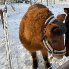 Bambuca kam körperlich sichtlich angeschlagen mit dem Zusatzvermerk "tragend" im Januar 2024 zu uns auf den Tierhof und musste aufgrund von Besorgnis auslösendem Verhalten alsbald in der Tierklinik vorgestellt werden. Dort fand man heraus, dass nicht etwa ein ungeborenes Fohlen die Ursache für seltsame Bewegungen und Körperhaltungen war, sondern ein nach Bruch verschobenes Becken!!! Nachdem die Schmerzen durch passende Schmerzmittel nicht mehr ausreichend zu regulieren waren, wurde unsere tapfere Bambuca am 11. April 2024 erlöst. Zuvor konnte sie noch angenehm milde und sonnige Frühlingstage zusammen mit den anderen Pferden auf der Koppel genießen :-)